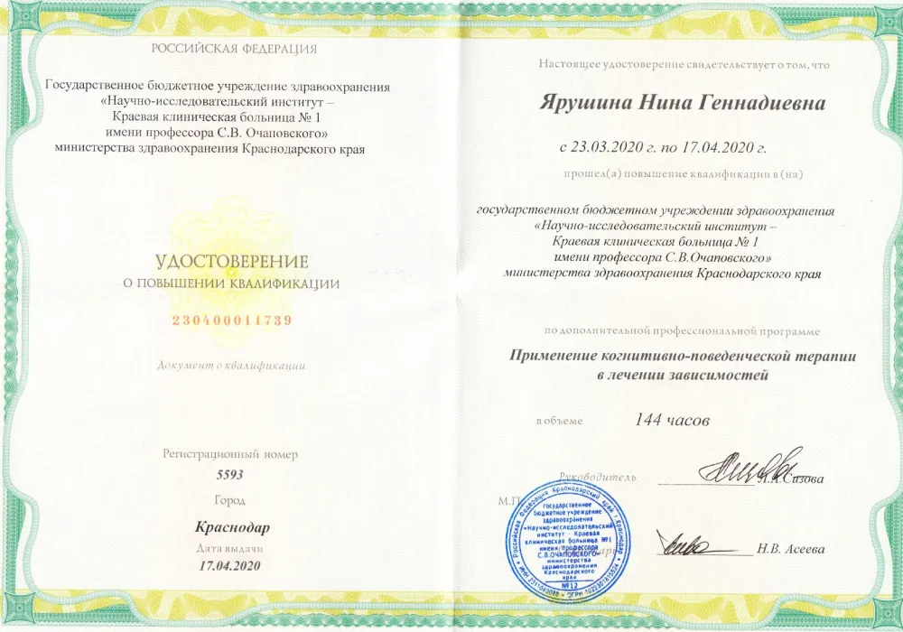 • 2017 — курс «Применение когнитивно-поведенческой терапии в лечении зависимостей».
